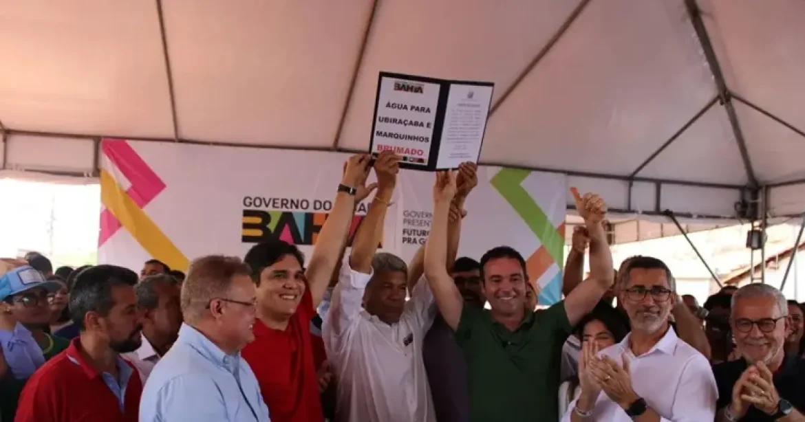 O governador Jerônimo Rodrigues (PT), assinou a ordem de serviço para a implantação dos sistemas de abastecimento de água na região do Distrito de Ubiraçaba e na Lagoa Funda, durante a visita ao município de Brumado, neste domingo (16), ao lado do prefeito da cidade, Fabrício Abrantes (Avante).