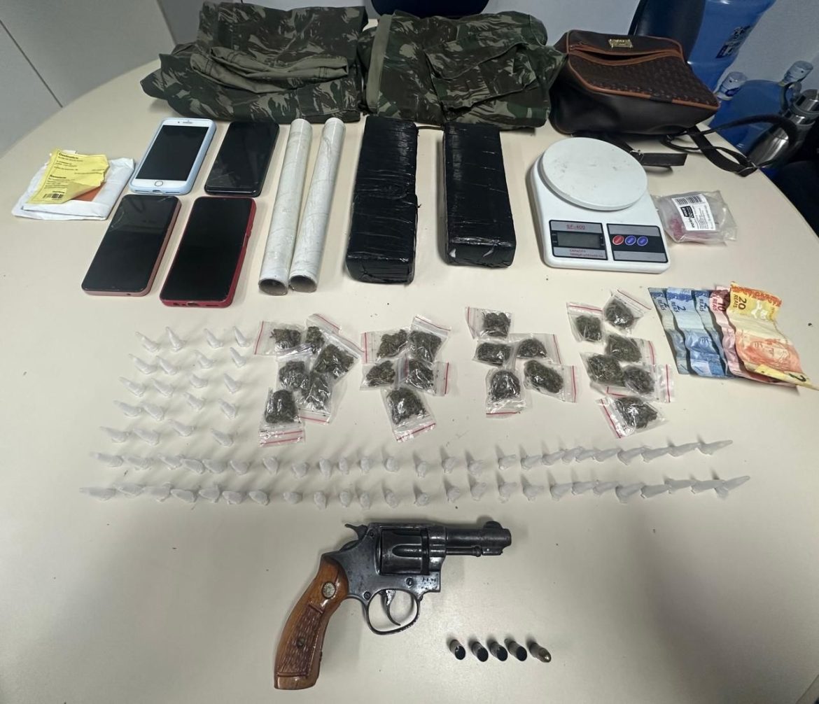 Um dos homens foi alcançado no solo, e com ele foi encontrado um revólver calibre .32, e uma bolsa contendo os seguintes materiais: 70 embalagens com substância análoga a cocaína; $42 em espécie, 04 celulares ; 02 tabletes de substâncias análogas a maconha; 70 unidades de micro tubos plásticos cônicos transparentes com substância análoga a cocaína; 05 estojos deflagrados de munição calibre . 32 e 01 intacta; – 01 Balança de Precisão; embalagens, um Fardamento Policial (Calça e Gandola Camufladas); 24 palelotes de maconha.