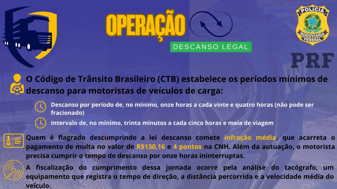 Atento a esta situação, a Polícia Rodoviária Federal (PRF) inicia, na quarta-feira (26), a operação Descanso Legal, que tem como foco a fiscalização de veículos de grande porte nas rodovias federais da Bahia, em especial para verificar o tempo que os motoristas profissionais passam ao volante. A iniciativa segue até o dia 4 de abril e busca assegurar que as normas sobre o tempo de descanso dos motoristas sejam cumpridas, pois o descanso adequado é essencial para manter os motoristas alertas e aptos a dirigir com segurança, além de prevenir sinistros e infrações relacionados ao uso irregular de caminhões e ônibus.