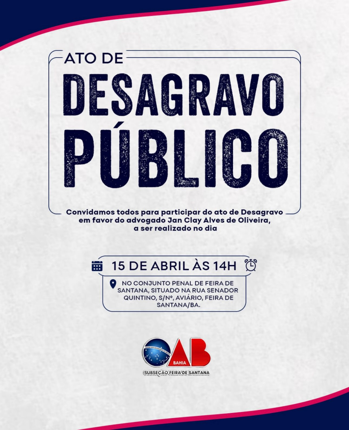 A OAB Bahia, em parceria com a OAB Subseção Feira de Santana, realizará nesta terça-feira (15), às 15 horas, no Município, um desagravo público em favor do advogado Jan Clay Alves de Oliveira. A ação acontecerá no Conjunto Penal de Feira de Santana, localizado na rua Senador Quintino.