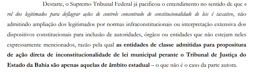 “O Supremo Tribunal Federal (STF), aliás, também já reconheceu que ‘a Associação Nacional dos Transportadores de Passageiros sobre Trilhos não detém legitimidade para propor ação direta de inconstitucionalidade, notadamente devido ao caráter heterogêneo dos associados por ela representados’. A associação autora, portanto, não é entidade de classe e não se enquadra no rol de legitimados à propositura de ação direta de inconstitucionalidade, como já decidido pelo STF”, argumenta a Prefeitura de Salvador.