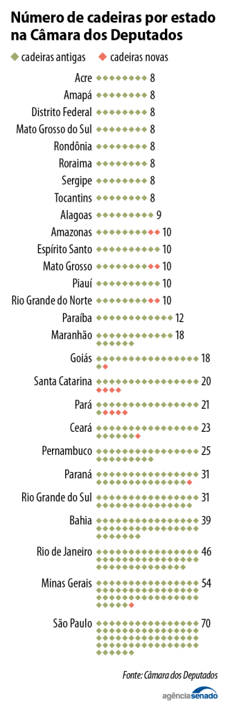 - Correção de distorções, de maneira que nenhuma unidade da federação com população maior que outra possa ter bancada menor, o que significou o acréscimo de mais quatro cadeiras