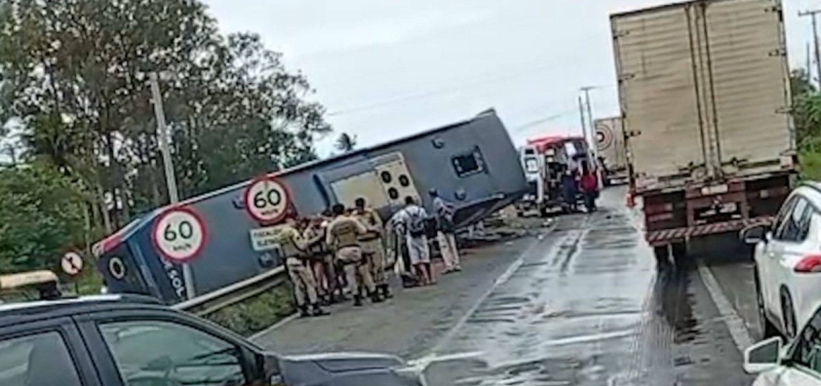 Um ônibus de viagem da empresa Cidade Sol tombou na tarde desta quinta-feira (4), na BR-324, em Feira de Santana. Segundo informações da Polícia Rodoviária Federal (PRF), duas pessoas ficaram feridas e nenhum óbito foi registrado.
