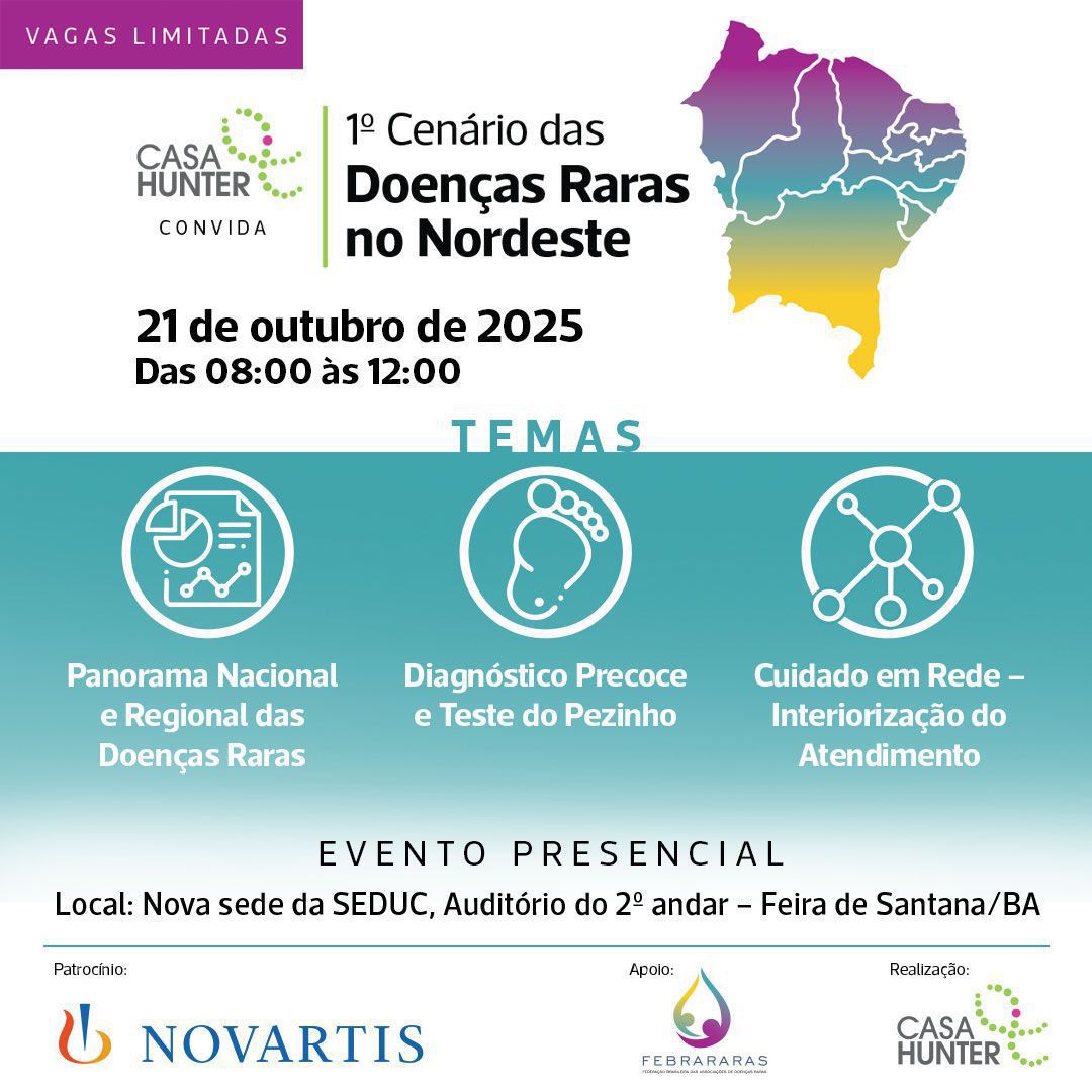 Feira de Santana sediará, pela primeira vez, o “Cenário das Doenças Raras no Nordeste”, no próximo dia 21 de outubro, das 8h às 12h. O evento, promovido pela Casa Hunter, com apoio da Febrararas e Novartis, reunirá especialistas, autoridades, associações, pacientes e familiares para debater os principais avanços e desafios no cuidado de pessoas com doenças raras na região.