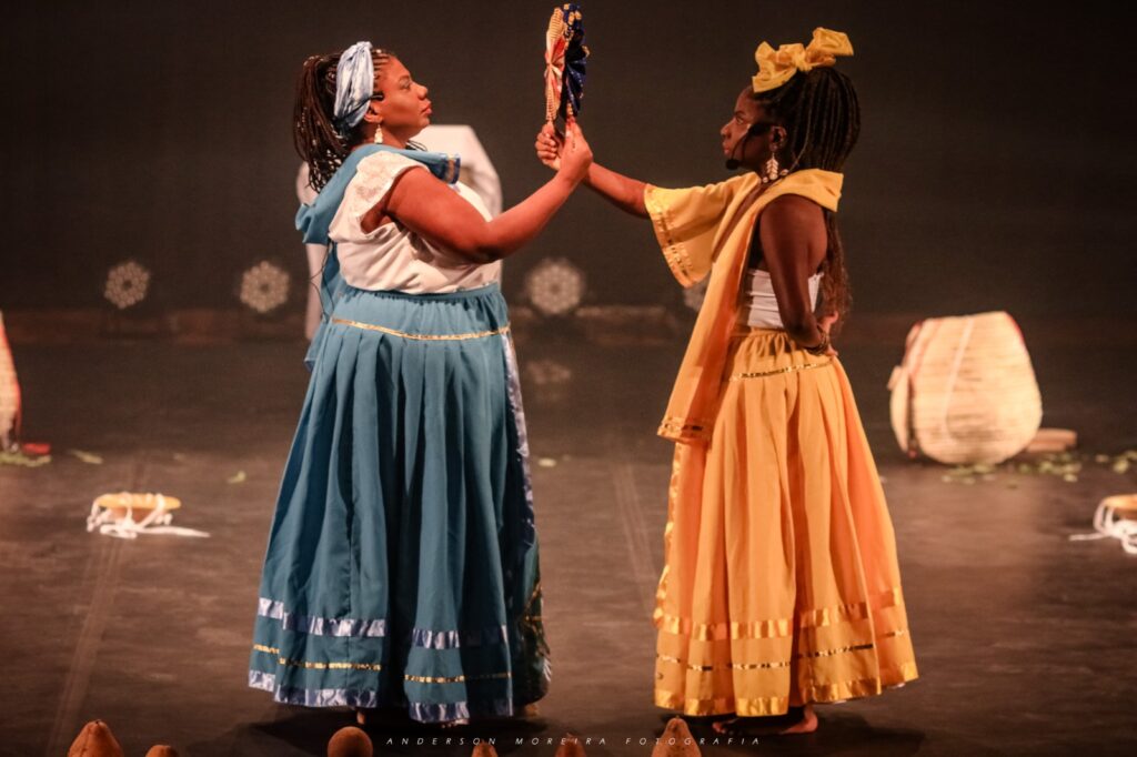 A encenação é marcada por uma linguagem cênica ancestral e simbólica, que dialoga com as religiões de matriz africana e destaca as representações das orixás femininas, convidando o público a uma reflexão profunda sobre identidade, espiritualidade e resistência.