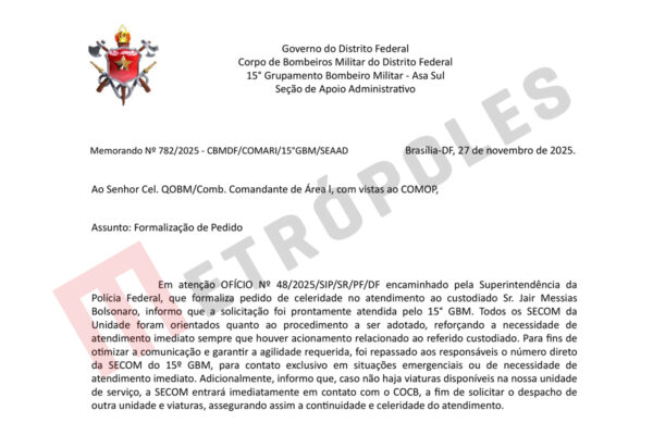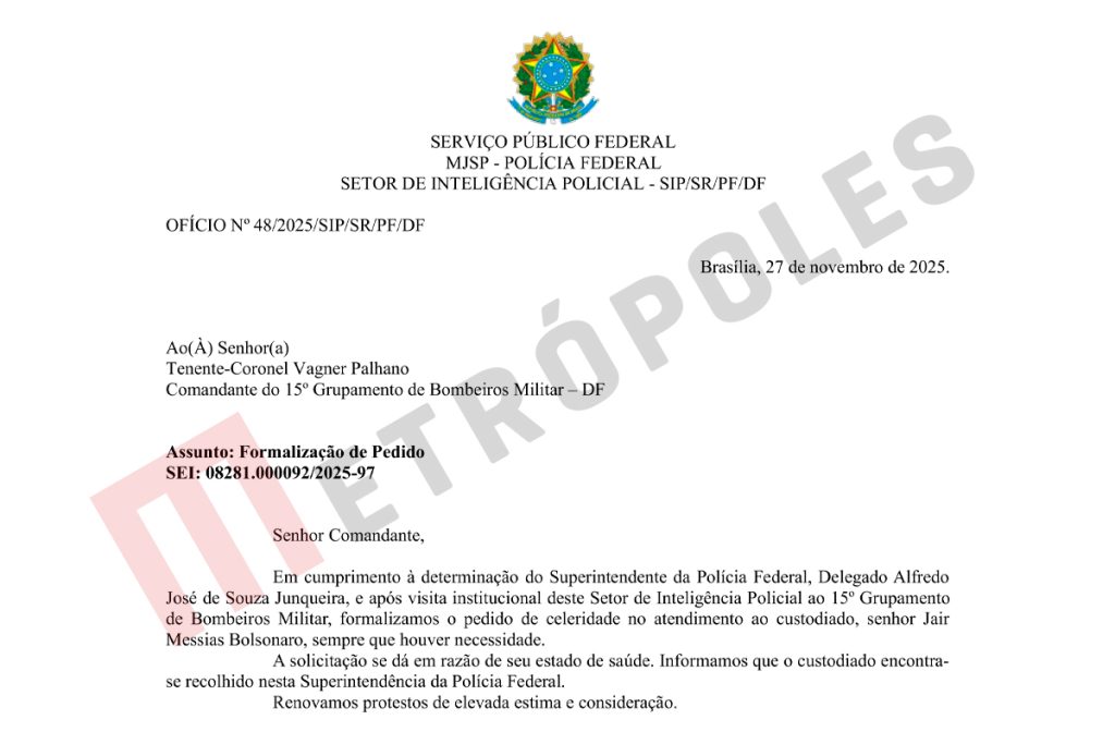O documento, obtido pelo Metrópoles, foi enviado ao 15º grupamento do CBMDF, localizado na Asa Sul, na quinta-feira (27/11). A PF argumentou que a solicitação “se dá em razão do estado de saúde” de Bolsonaro. O ex-presidente está preso na Superintendência Regional da Polícia Federal do Distrito Federal. Ele cumpre a pena de 27 anos de prisão por tentativa de golpe de Estado.