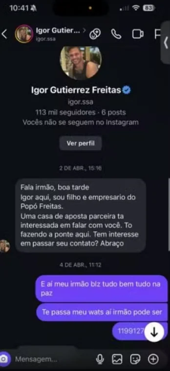 Conforme documentos obtidos pelo GloboEsporte, Igor Freitas teria iniciado contatos com jogadores por meio do Instagram e do WhatsApp, apresentando-se como filho de Popó e também como “empresário e representante com acesso direto às maiores empresas do mercado nacional”, além de afirmar estar “atuando em projetos estratégicos, ativações e negociações de patrocínios e parcerias”.