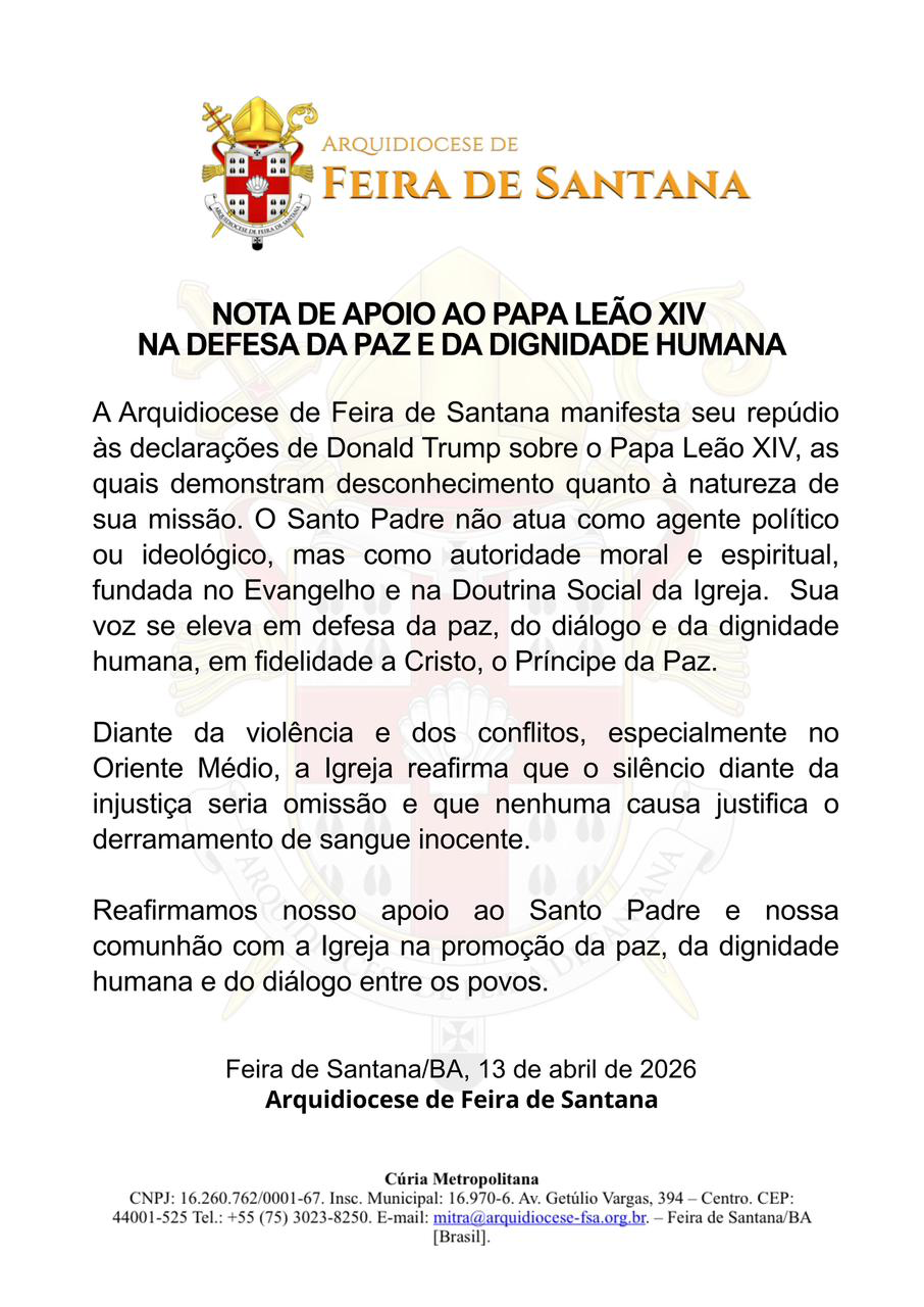 No Brasil, além da manifestação da Igreja de Feira de Santana, a CNBB também se posicionou publicamente em defesa do Santo Padre. Em nota, os bispos afirmaram estar unidos ao Papa “na defesa da paz, da dignidade humana e do diálogo entre os povos”, destacando que sua autoridade moral nasce do Evangelho, e não de disputas políticas.